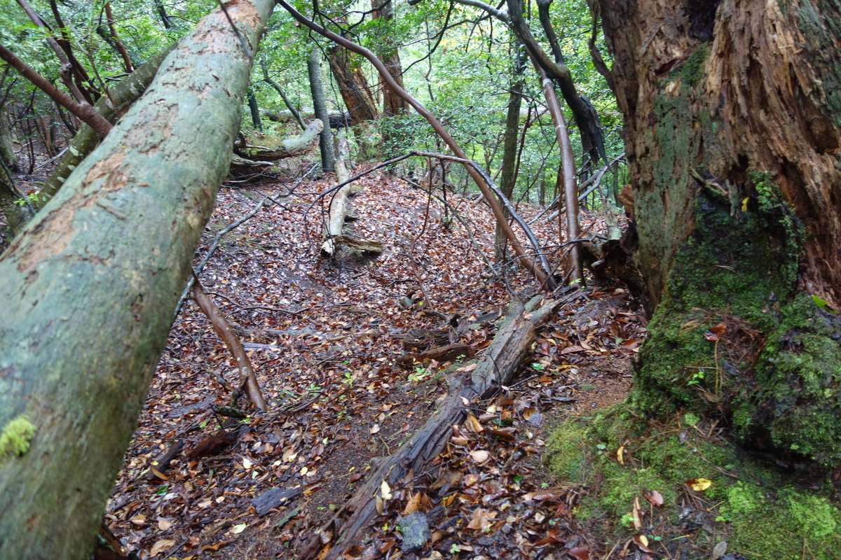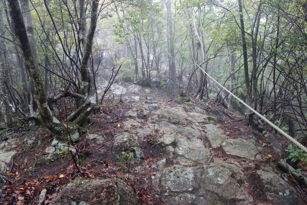 急な上り路を登攀することになるところには、ロープが設置されている。息を切らしながら登ると、石垣が見えてくる。