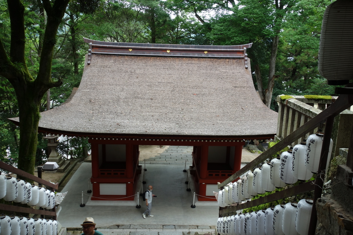 本殿の北側にある拝殿は、見た目は檜皮葺の屋根と瓦葺の屋根の重層のように見えるが、実際は屋根裏まで吹き抜けの構造である。