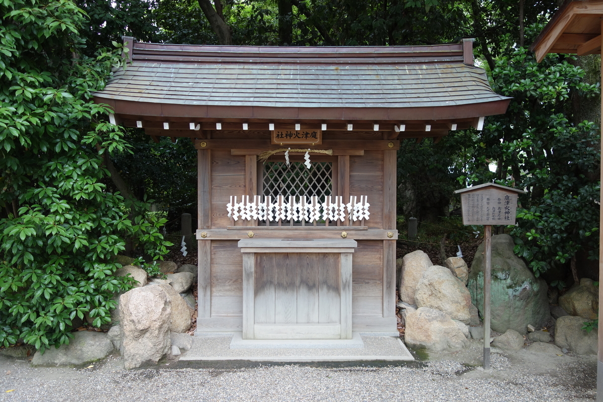 境内を奥に進んでいくと、林の中に残る塚を祀った庭津火神社がある。